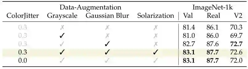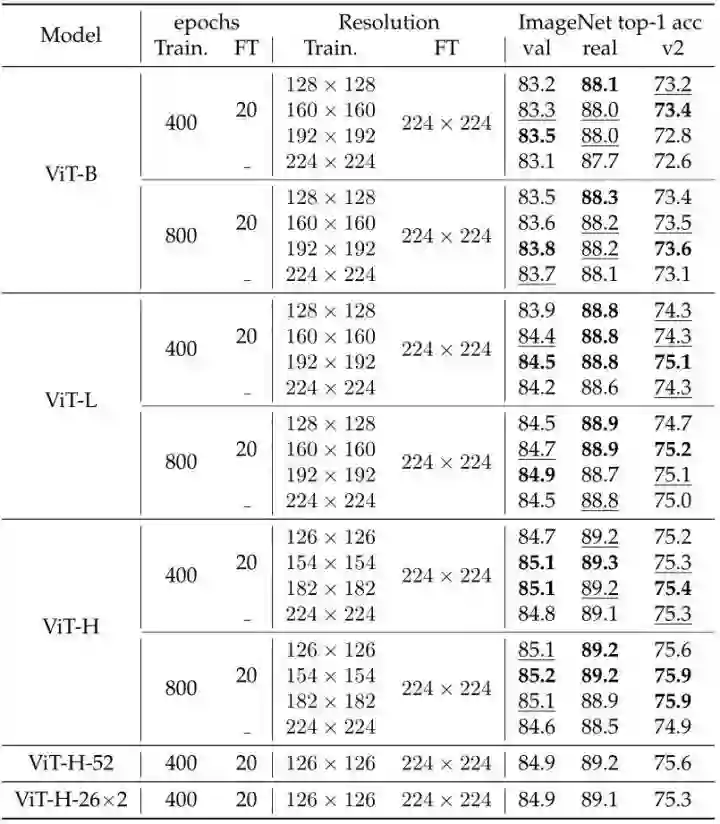 当仅在 ImageNet-1K 上训练时,默认情况下,作者都是训练 400 Epoch,Batch size 大小为2048。除非另有说明,否则训练和测试都是以 224×224 的分辨率进行的。