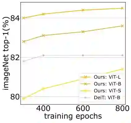 如下图7所示为训练 Epoch 数的消融实验结果。结果表明,当将训练的 Epoch 数增加到超过 400 时,ViT 模型不会像 DeiT 训练策略那样快速饱和,即训练 600 Epoch,800 Epoch 时精度会一直不断提升。