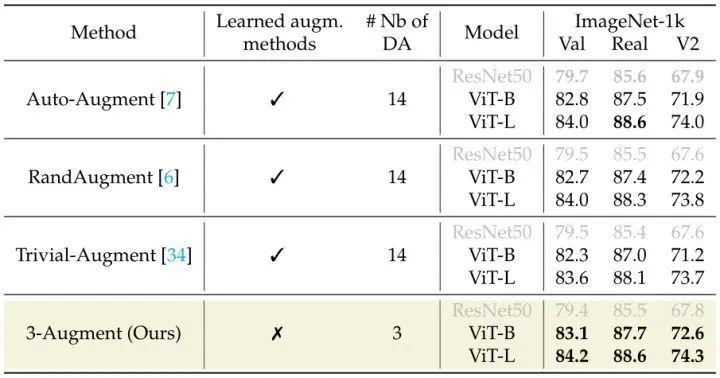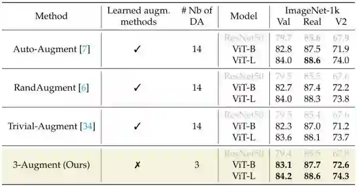 如下图8所示为数据增强策略的消融实验结果。当使用 ViT 架构进行实验时,本文所提出的 3-Augment 是最有效的,同时比其他方法更简单。因为之前的数据增强手段是为卷积模型而开发的,所以作者也提供了 ResNet-50 的结果:先前的增强策略 (RandAugment, Auto-Augment) 对于 ResNet-50 模型而言在验证集上具有相似的或更好的结果,但是对于 ViT 模型而言在验证集性能不如 3-Augment。