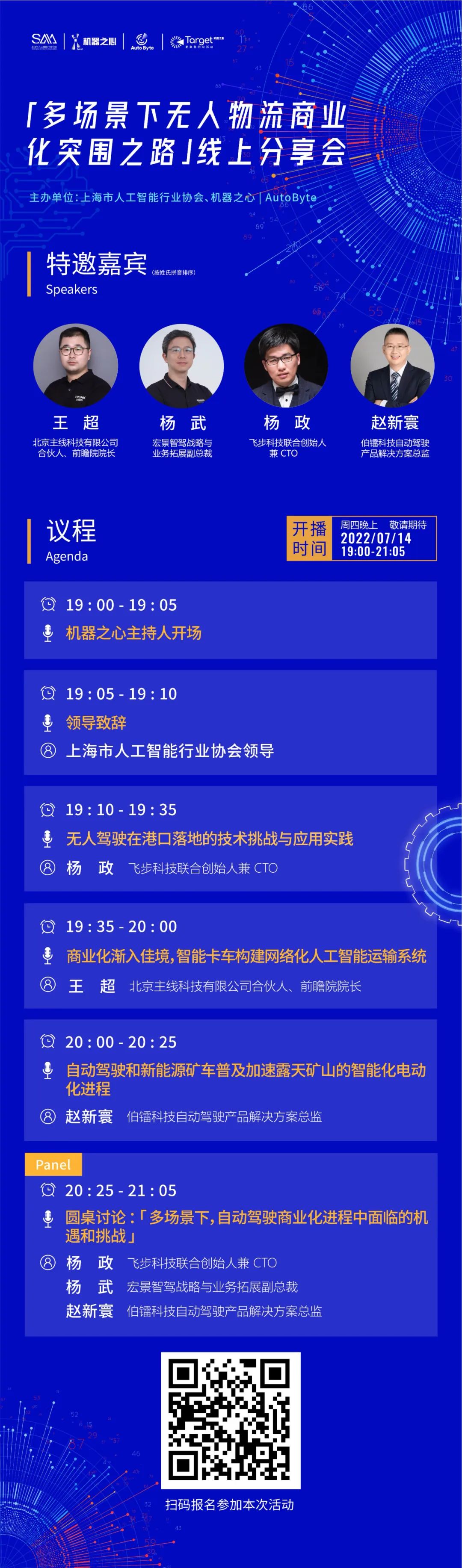 7 月 14 日 19:00 - 21:05,机器之心联合上海市人工智能行业协会举办「多场景下无人物流商业化突围之路」线上分享会,邀请相关企业代表及技术专家,分享自动驾驶相关企业布局特定场景下的无人化物流遭遇的瓶颈和痛点问题,解读行业最新的技术热点、应用挑战和相关政策法规,共同探讨多场景下无人物流商业化破局之路。