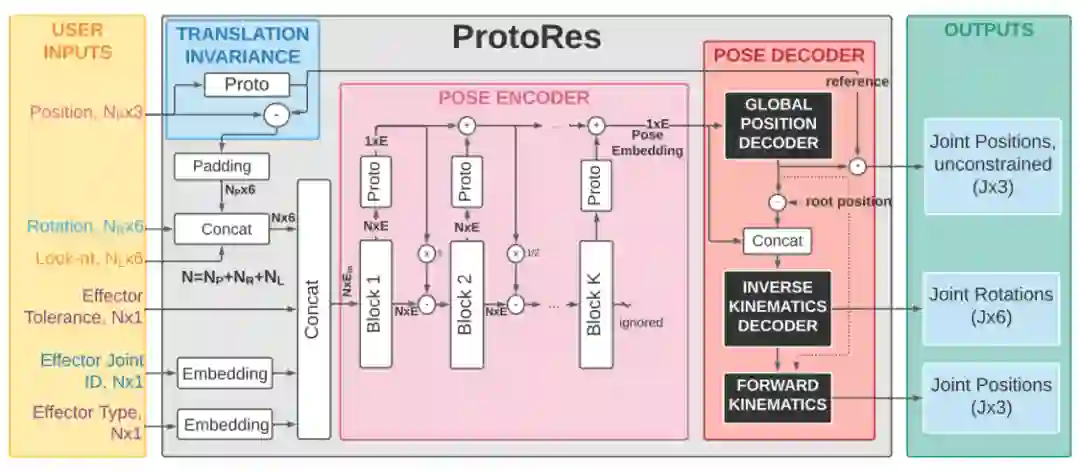 该研究提出的 ProtoRes 架构如下图所示,遵循编码器 - 解码器模式,并分三个步骤生成预测。首先,用户提供数量和类型可变的输入,这些输入被处理以实现平移不变性(translation invariance)和嵌入。其次,该架构的核心是 proto-residual 编码器,将通过效应器指定的姿态转换成单个向量(姿态嵌入)。最后,姿态解码器将姿态嵌入扩展到全身姿态表征,包括每个关节的局部旋转和全局位置。