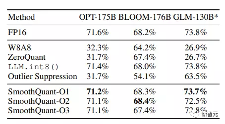 研究人员选择了三个大型语言模型用来评估SmoothQuant,包括OPT, BLOOM和GLM-130B;并使用七个zero-shot任务,包括LAMBADA, HellaSwag, PIQA, WinoGrande, OpenBookQA, RTE, COPA等。