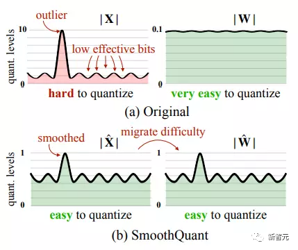 最近,麻省理工学院和英伟达的研究人员联合提出了一个通用后训练的量化(GPQ, general-purpose post-training quantization)方案SmoothQuant,对大型语言模型可以高效实现8-bit权重,8-bit激活(W8A8)的量化,无需训练也能保持模型的准确率。
