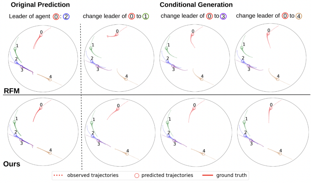 如下图所示,IMMA 中改变 agent 的 leader 会显著改变预测的轨迹,以新 leader 为目标,同时保持对其他 agent 的预测不变。而 RFM 生成的轨迹包括不切实际的转弯 (如红色 agent) 并且对其他 agent 的轨迹预测变差。