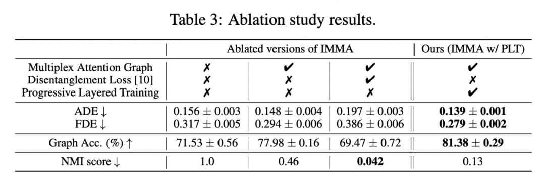 Ablation study 结果如 Table 3 所示,实验结果证明 multiplex attention graph 在模型中起到了至关重要的作用,逐层训练进一步提升了轨迹预测和关系推理准确度。
