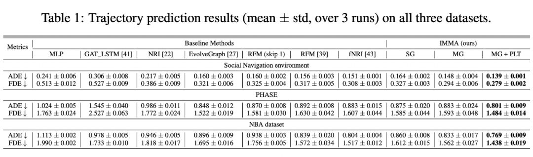 该研究主要用以下三个数据集进行实验:Social Navigation Environment  (基于 ORCA), PHASE dataset 和 NBA dataset,所有数据集上的结果如 Table 1 所示。该研究发现使用 Multiplex attentional latent graph 和渐进层训练 (MG w/ PLT) ,结果在所有三个数据集上都优于已有的最强基线模型。