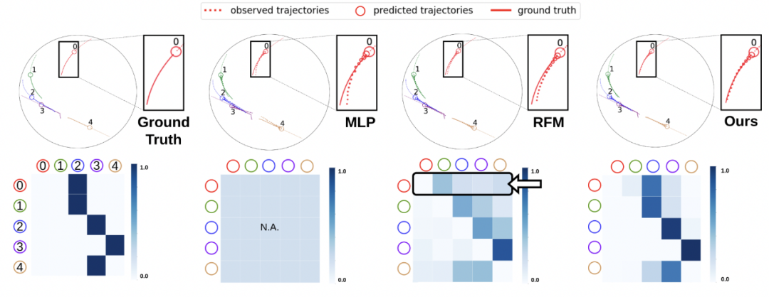 对于 Social Navigation dataset 的可视化结果如下图所示。第一排表示预测轨迹。圆圈越小表示离当前时间点越远。最左边是真实的未来轨迹和交互关系图。第二排表示预测的 latent graph。智能体 i 和 j 之间的 relation 由 heatmap 中的第 i 行第 j 列的元素表示。RFM 错误地预测了智能体之间的关系——用箭头突出显示,绿色 agent 被错误地赋予了比蓝色 agent 更高的权重。因此,预测的轨迹偏离了事实。相反,本文方法准确地预测了交互关系和未来轨迹。