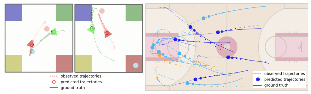 本文方法在 PHASE(左)和 NBA 数据集 (右) 的结果可视化如下图所示。在右侧的 NBA 图中,橙色代表篮球,不同轨迹颜色代表不同球队。