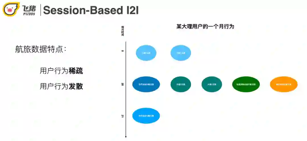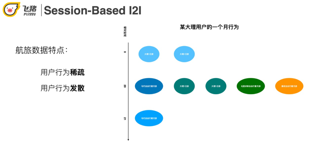 航旅用户的行为有稀疏和发散的特点。利用右图一个具体的用户实例来说明这两个特点:用户在第一天点击了两个大理一日游,第20天点击了一些马尔代夫蜜月相关的商品,第21天又点击了大理的一日游。稀疏性体现在一个月只来了3次,点击了8个宝贝。发散性体现在用户大理一日游和出国蜜月游两个topic感兴趣。