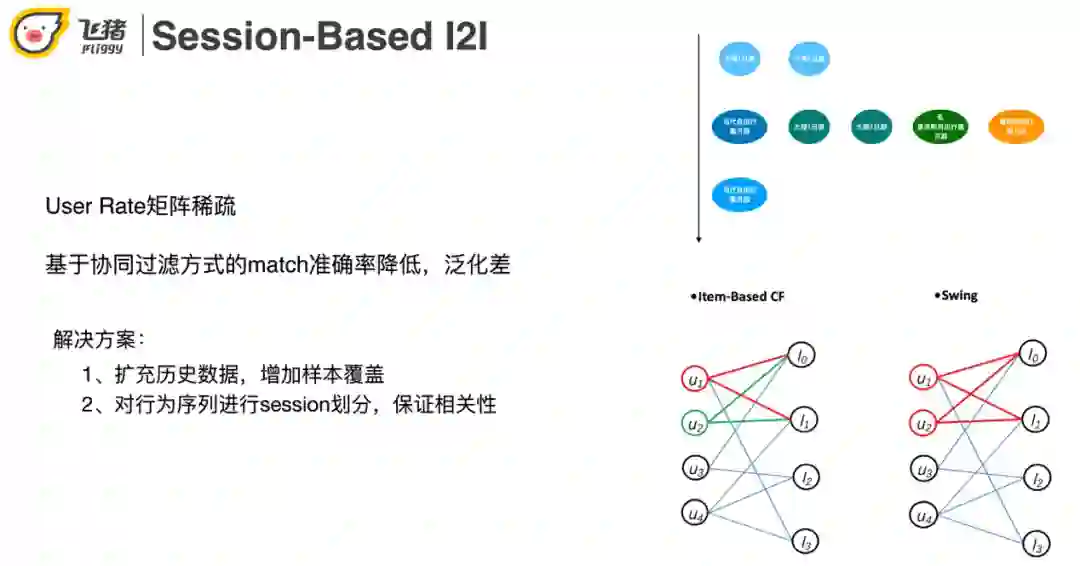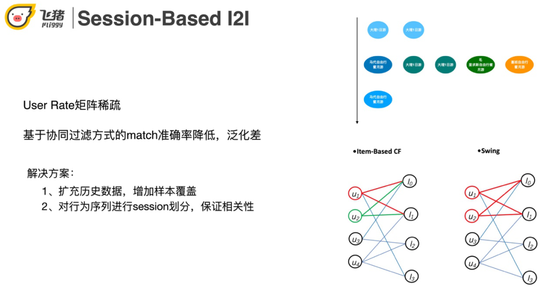 在用户有行为的情况下进行召回,我们常采用的方法是基于User-Rate矩阵的协同过滤方法 ( 如ItemCF,Swing。ItemCF认为同时点击两个商品的用户越多则这两个商品越相似。Swing是在阿里多个业务被验证过非常有效的一种召回方式,它认为user-item-user的结构比itemCF的单边结构更稳定 ),但是由于航旅用户行为稀疏,基于User-Rate矩阵召回结果的准确率比较低,泛化性差。针对这两个问题我们可以通过扩充历史数据来增加样本覆盖。航旅场景因为用户点击数据比较稀疏,需要比电商 ( 淘宝 ) 扩充更多 ( 时间更长 ) 的数据才够。这又带来了兴趣点转移多的问题。在这里我们采用对行为序列进行session划分,保证相关性。