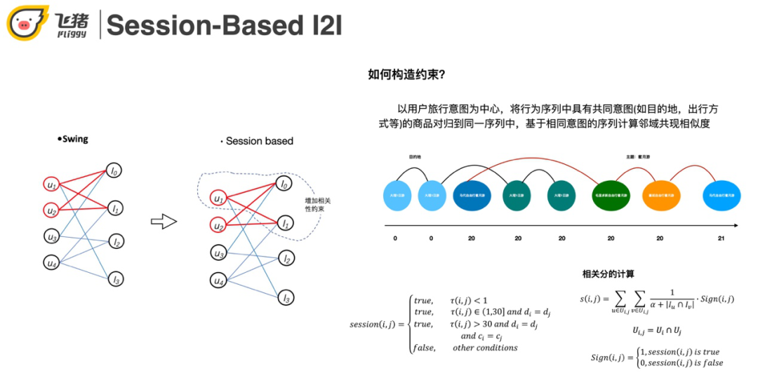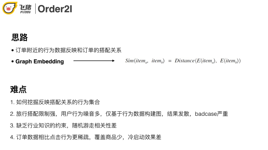 - 相关性vs搭配性:航旅场景下要求搭配性比较高,传统的I2I只偏重相关性。但用户的行程需求不是单点的,比如买了飞机票还要看住宿。行程受上下文影响比较多,比如季节、用户近期行为等。