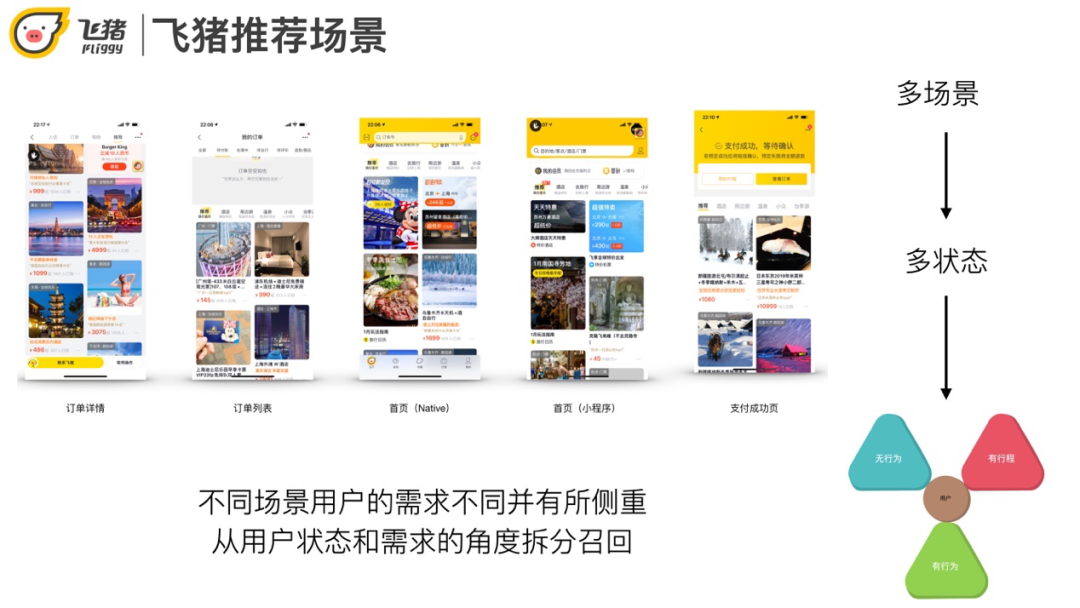 飞猪的推荐页面有很多,比如首页,支付成功页,订单列表页,订单详情页都有猜你喜欢。不同页面对应了不同的场景,用户在不同场景下需求不同,也有一定的交叉。比如首页偏重逛/种草,但支付完成后推荐一些与订单相关的商品会更好。