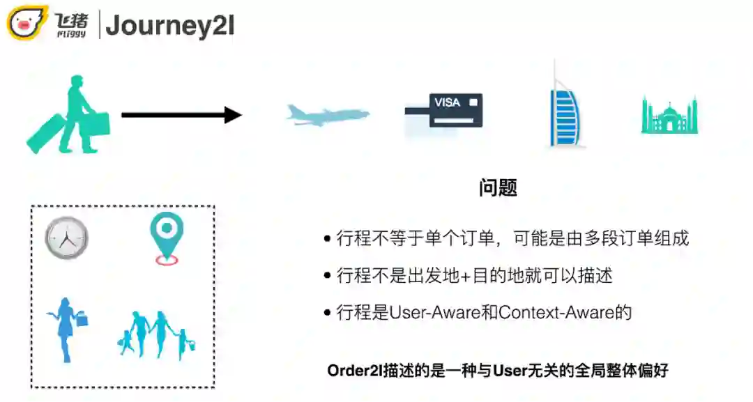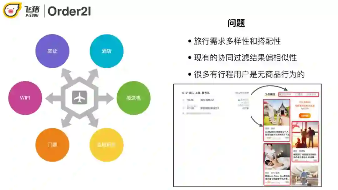 在飞猪场景下用户有类似如下的需求:买了去某地的机票,用户很可能需要与之搭配的签证/wifi/酒店等等,而协同过滤通常只能推出同类型商品,比如门票推门票,酒店推酒店。另外飞猪不像淘宝用户可能会经常逛,有比较丰富的历史行为信息可以供我们去分析和计算,飞猪用户通常是"买完即走"。