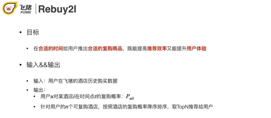 输入用户在飞猪的酒店历史购买数据,输出是用户在某个时间点对某个酒店的复购概率。当有多个可复购酒店时,按照概率降序排序。
