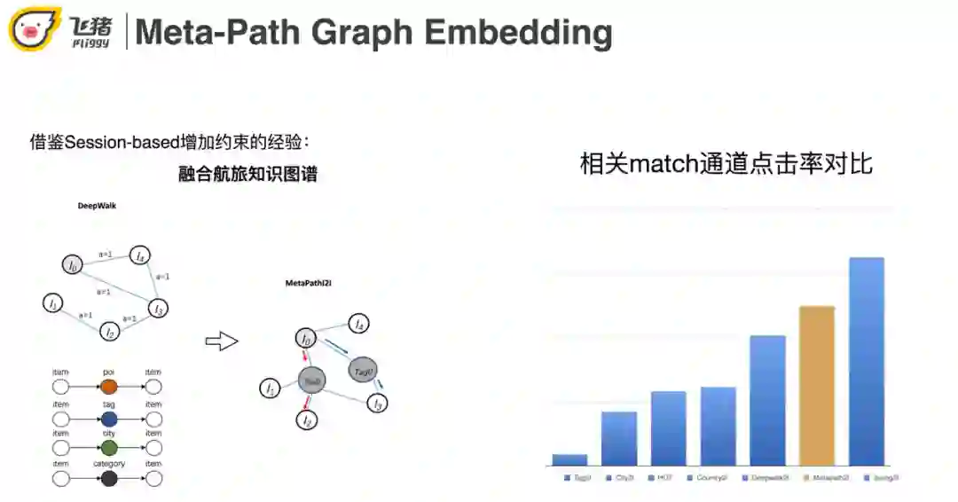 解决Embed相关性低的方式借鉴了session-based召回的经验,将航旅知识图谱融合,构建航旅特定的Meta-Path。效果上看meta-path的效果是比deepwalk更好。