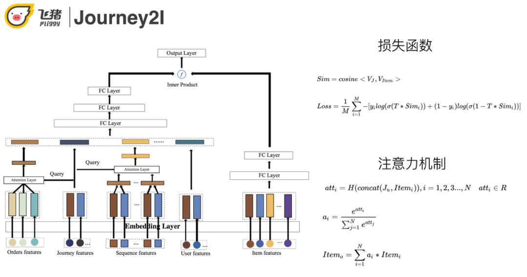 模型左边主要是利用行程特征对订单序列以及用户的历史行为序列进行attention操作,用于识别关键订单以及用户关键行为。在此基础上融合行程特征和用户属性特征学习用户该段行程的Embed。模型右边是商品特征,经过多层MLP之后学习到的宝贝Embed。两边做内积运算,利用交叉熵损失进行优化,这样保证召回的结果不仅与行程相关还与用户行为相关。