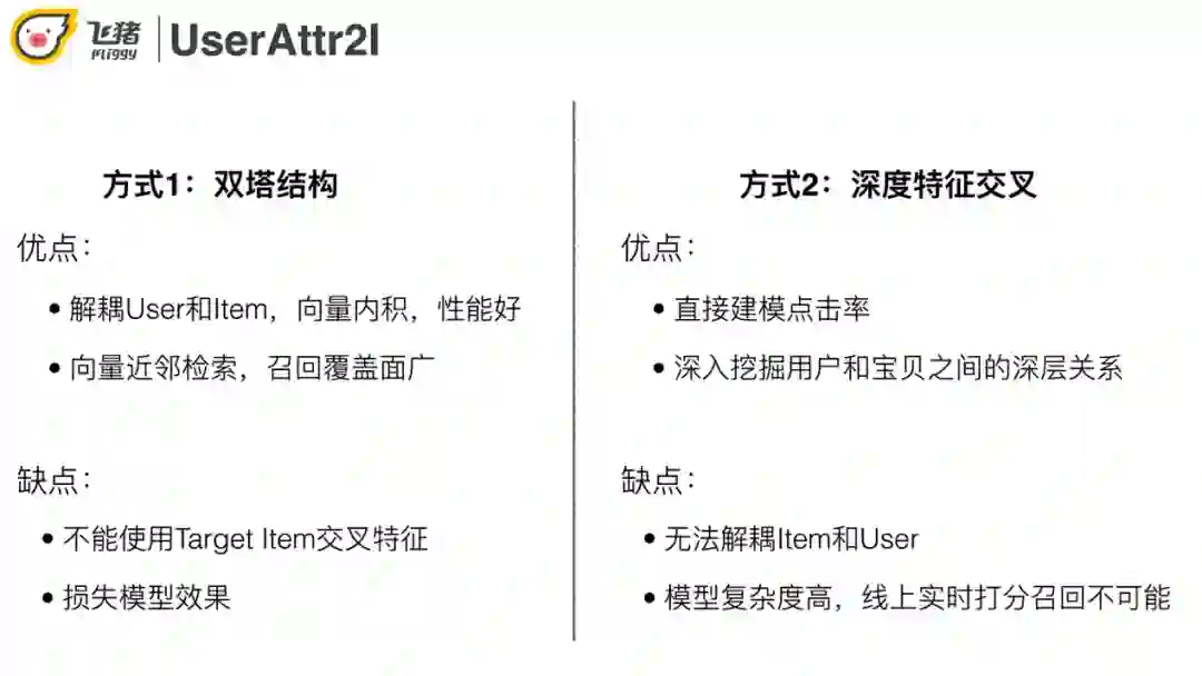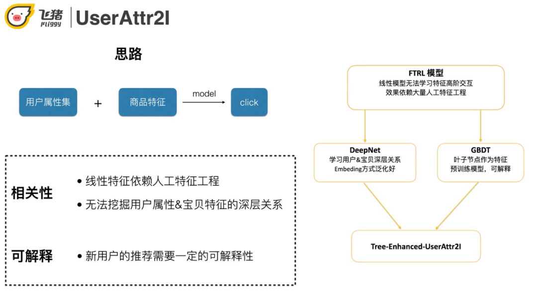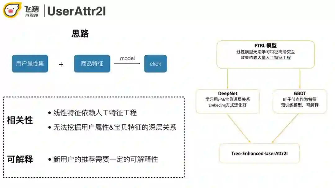 在这里介绍我们的方案UserAttr2I,使用类似排序模型的方法,输入用户+商品的属性,预测用户是否会点击一个商品。
