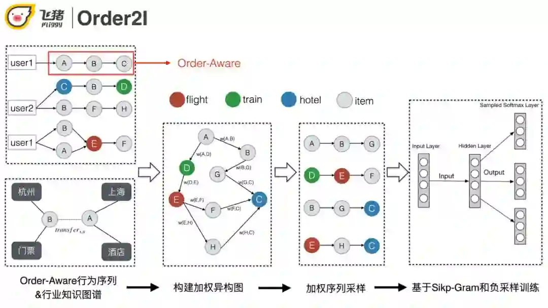 利用航旅知识图谱以及用户的行为序列进行加权异构图的构建 ( 机票/火车票节点利用业务线+出发地+目的地唯一标示、宝贝&酒店利用其id唯一标示 )。之后的流程和传统的Graph Embedding类似。