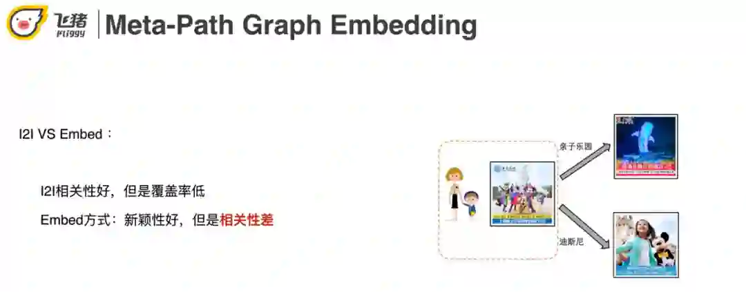 基于I2I相关矩阵的优点是相关性好,缺点是覆盖率比较低。而Embed的方式虽然新颖性好但是相关性差。右边的case是Embed的召回结果,上海迪士尼乐园召回了一个珠海长隆的企鹅酒店和香港迪士尼。我们期望的应该是在上海具有亲子属性,或者在上海迪士尼附近的景点。
