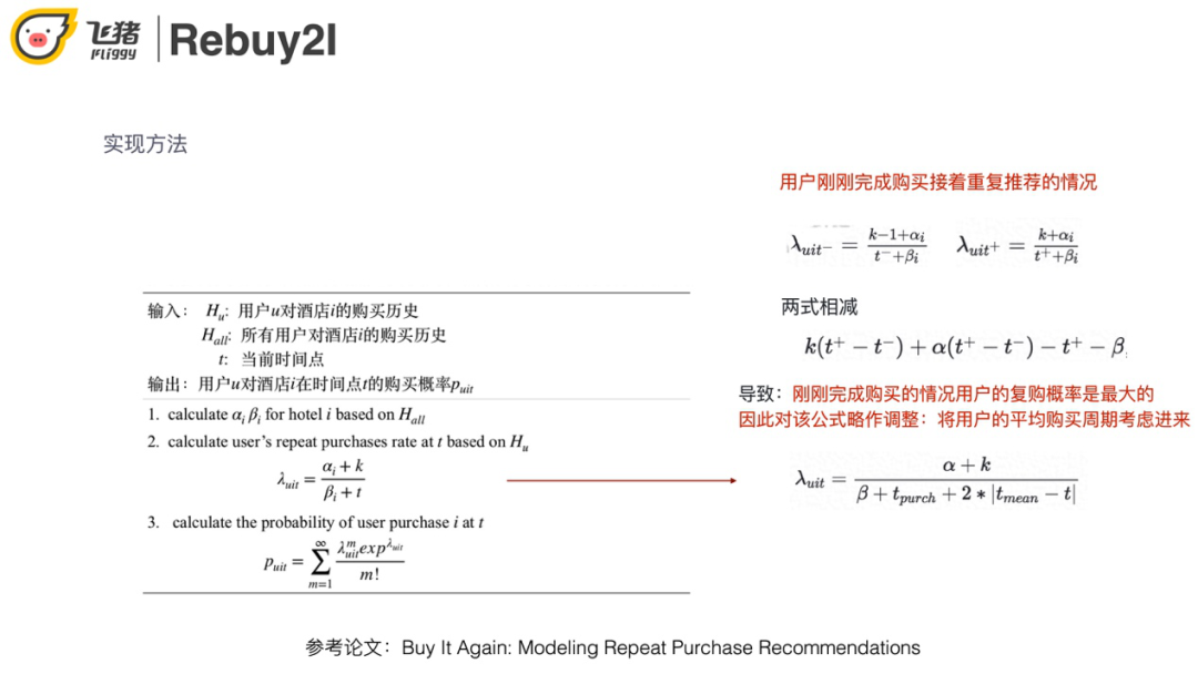 首先取用户对酒店的购买历史,利用矩估计/参数估计计算酒店的购买频次 ( 参数α和β )。接下来就可以调整每个用户的购买概率,k是购买次数,t是第一次购买距离最近一次购买的时间间隔。最后代入Possion分布计算复购概率,加入用户的平均购买周期来缓解刚刚完成购买的酒店复购概率最大的问题。
