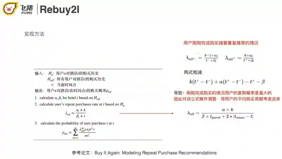 首先取用户对酒店的购买历史,利用矩估计/参数估计计算酒店的购买频次 ( 参数α和β )。接下来就可以调整每个用户的购买概率,k是购买次数,t是第一次购买距离最近一次购买的时间间隔。最后代入Possion分布计算复购概率,加入用户的平均购买周期来缓解刚刚完成购买的酒店复购概率最大的问题。
