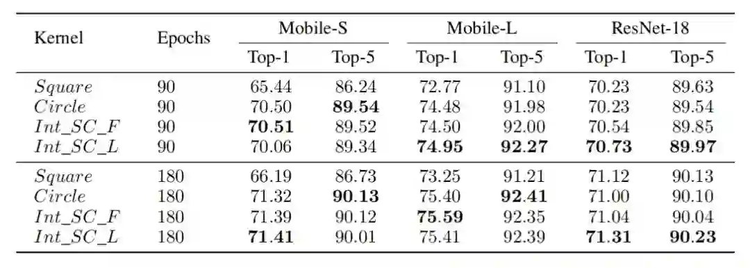 在ImageNet上,作者基于MobileNet和ResNet进行了实验。可以看出,圆核的方法会比方核的性能要更好。总体来说,可以学习的圆核和方核在性能上表现会更好一些。