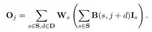 对于一个3x3的方形卷积,可以用下面的公式表示(对感受野内的特征进行加权求和):