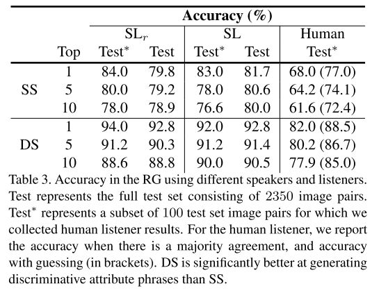 表3. 在参考游戏机制下,测量使用不同的说者和听者识别的准确性。 测试集是由2350个图像对组成的完整测试集。 Test*表示100个测试集图像对的子集,这些图像对是作者收集的人类听众结果,。 对于人类听众,我们报告了在有多数协议时的准确性,以及猜测的准确性(括号内)。表中显示DS比SS更能产生有区别的属性短语。