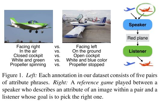图1. 左图:本文数据集中的每个注释都由五对属性短语组成。右图:展现了说者和听者之间的参考游戏机制,说者描述一对图像中一个的属性,而听者的目标是从这对图像中选择正确的那个。