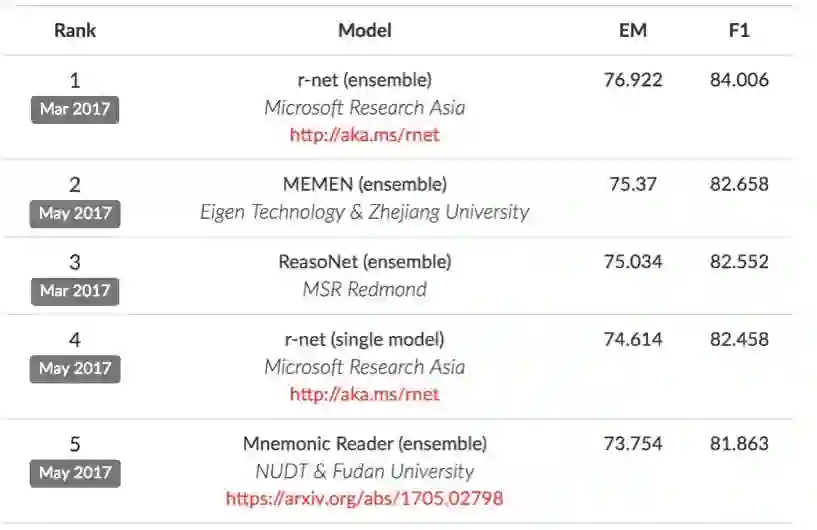 该数据集一经推出便引发学术界的持续关注,在SQuAD的Leadeboard上不断有新的模型提出一遍遍刷新benchmark,截止目前(2017年6月),最好的方法已经获得超过84的F1值。值得一提的是,Standford在推出该数据集时,基于传统Lexical特征工程的方式构造了Baseline(考虑Word/POS/Dependency..),作为白盒模型有较好的比较意义,同时也提供了人工评测的Acc作参照,方便衡量问题上界。