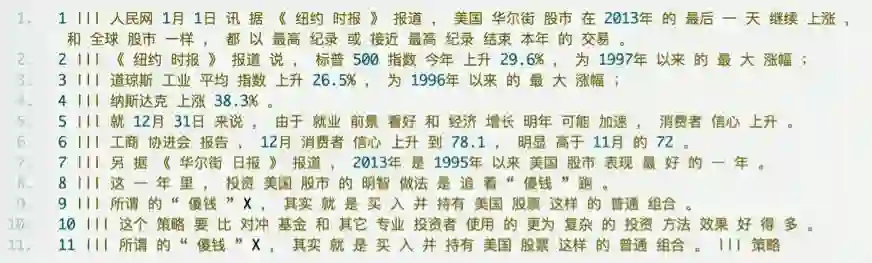 这是一份中文数据集,和CBT类似,这份数据集是根据真实的新闻数据由自动标注的方式获得的完形填空数据集,数据集较大,共有87万篇。