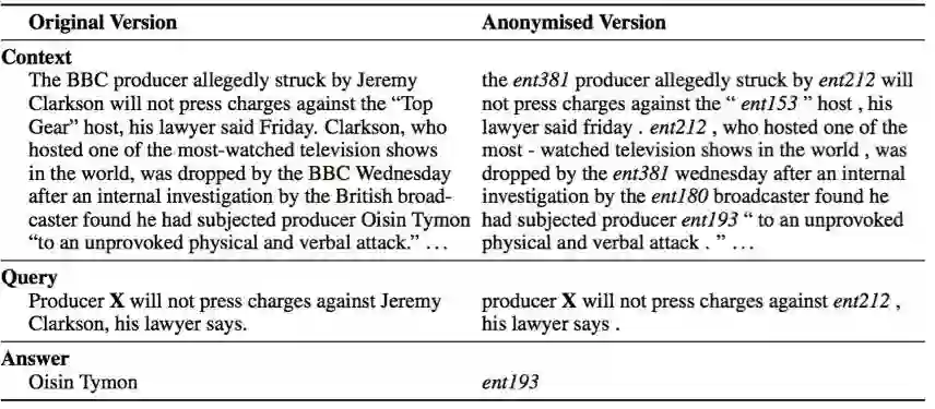 该数据集来自于真实的新闻数据,但由自动标注而得,并非人工标注。给出一篇新闻和一个问句,把问句中的某个实体抽掉,要求能正确预测被抽掉的实体。这个实体必须是在文中出现过的。该数据集的数据量相对比较大,CNN9有万篇,DailyMail有22万篇。