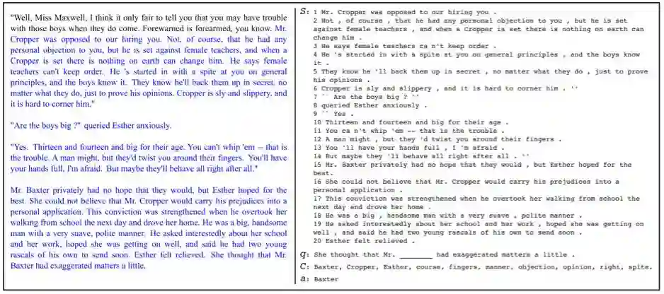 该数据集也是由真实的儿童读物,由自动标注方式构成,其形式是给出21个句子,前20个是完整的供机器阅读的句子,将第21个句子中的实体抽掉,要求能正确预测出来。