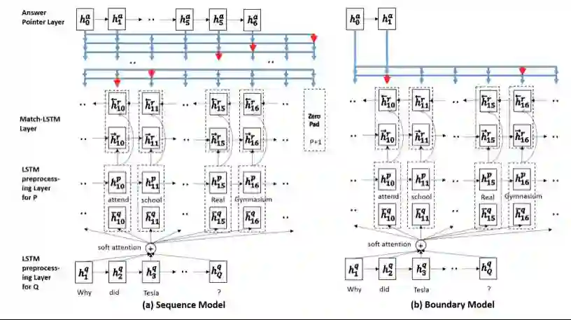 (3)利用pointer net从passage中选择tokens作为答案。包括Sequence Model和Boundary Model。其中Sequence Model是在passage中选择不连续的word作为answer;BoundaryModel只需要passage的起始位置和中止位置得到连续的words作为answer。