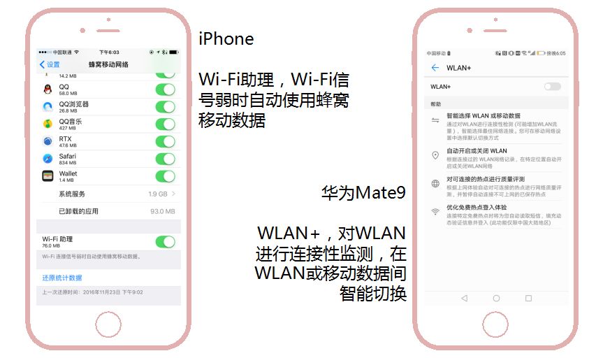 我们再来假设一个场景:你在客厅上网,因为离路由器比较近,你的wifi访问速度又快又流程;接下来你跑到了阳台,wifi信号不好了,这时候你只能手动把wifi关掉,切换成3G/4G。这就是一个典型的因为环境发生变化,造成了用户体验差异的案例。为了解决这个问题,现在很多手机上都会有wifi与数据网络自动切换的功能。