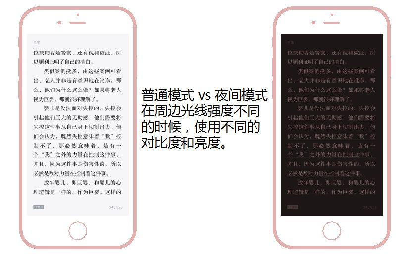 “过程中”这个关键词暗示我们在设计产品的时候,需要考虑具体使用过程中的环境因素。比如很多阅读App一般都会有夜间模式这个功能,通过调暗背景颜色、内容和背景之间的对比度,让黑暗环境下的阅读体验更好。