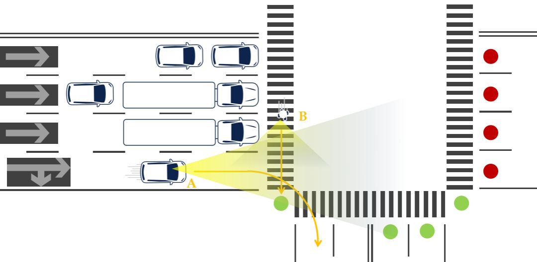 这个规则在实际路面中会产生什么问题呢?行人B和右转车辆A都会因为视角盲区而产生不好的通行体验。如果我们把这条交规看作一个产品逻辑的话,那么这个产品逻辑影响到了用户体验,我们需要在逻辑上想办法解决这个问题。