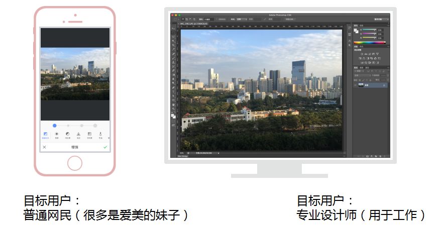 我们在谈用户体验的时候,决不能脱离用户而谈。对于不同的目标用户来说,“用户体验好”的定义是不同的。比如美图秀秀和Photoshop,它们都可以处理图像,但是由于他们的目标用户完全不同,所以我们不能简单地回答哪一个软件的用户体验更好。