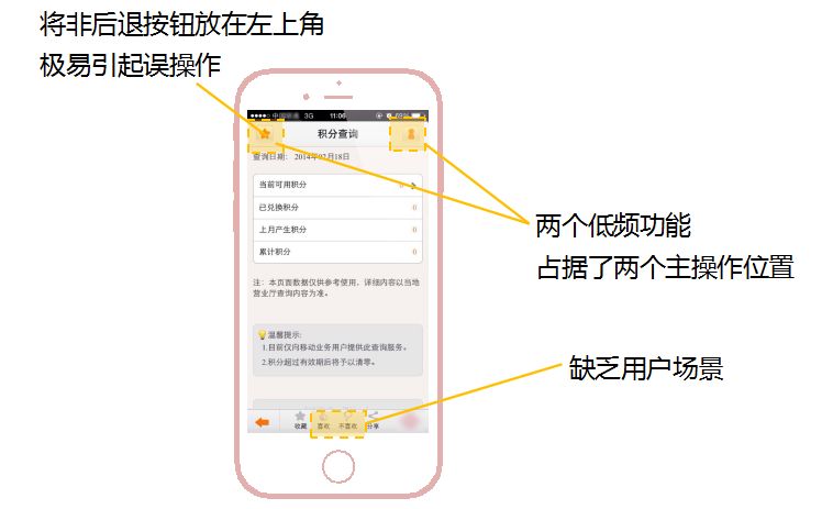 这是某电信运营商APP的积分查询页面截图。在iOS设计规范里,我们一般会把“返回”按钮放在UI标题栏的左上角。在这个案例中,本应放置返回按钮的位置(左上角)却放了一个星标,即收藏功能。