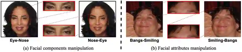 再者,改变篡改先后顺序,如下图(a)中鼻子和眼睛导致不同的注视方向,和(b)中留海和微笑的先后顺序会产生不同的刘海数量,这说明篡改顺序会进一步影响篡改所影响的空间关系。