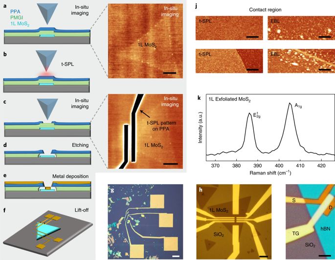 他们演示的这种刻蚀技术,采用了加热至100摄氏度以上的探针,超越了在二硫化钼等二维半导体上制造金属电极的普遍方法。科学家们相信,这种过渡金属属于有望替代硅应用于原子级微型芯片的材料。团队开发的新制造方法,称为“热扫描探针刻蚀技术(t-SPL)”,相比于目前的电子束光刻技术(EBL)具有一系列优势。