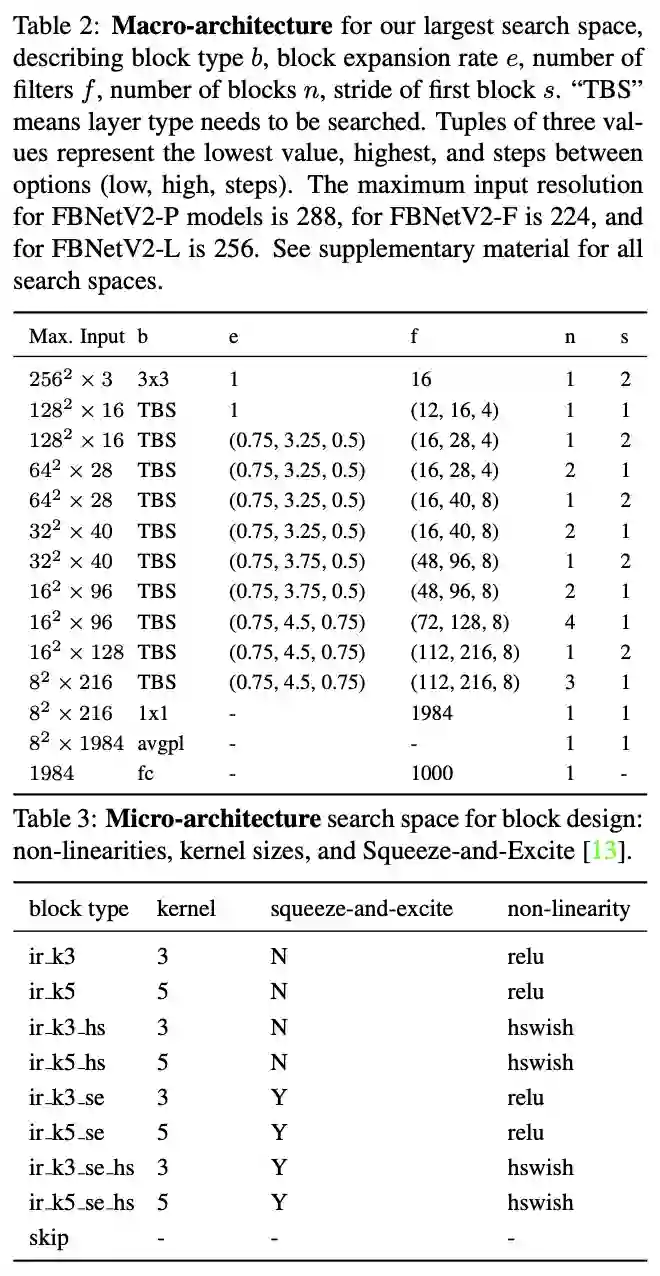 之前的方法大都搜索单元结构,然后堆叠成完整的网络,但实际上,相同的单元结构在不同的层对网络的准确率和时延的影响是大不相同的。为此,论文构造了整体网络结构(macro-architecture)固定的layer-wise搜索空间,每层可以选择不同结构的block,整体网络结构如表1所示,前一层和后三层的结构是固定的,其余层的结构需要进行搜索。前面的层由于特征分辨率较大,人工设定了较小的核数量以保证网络的轻量性。