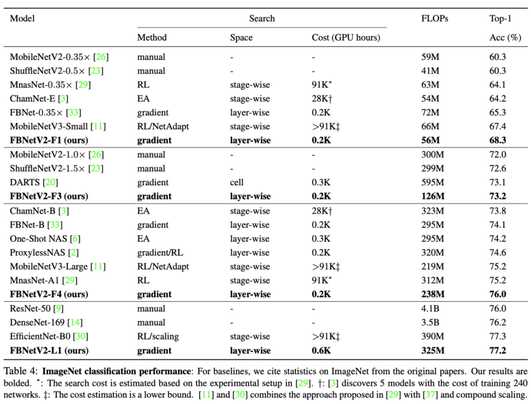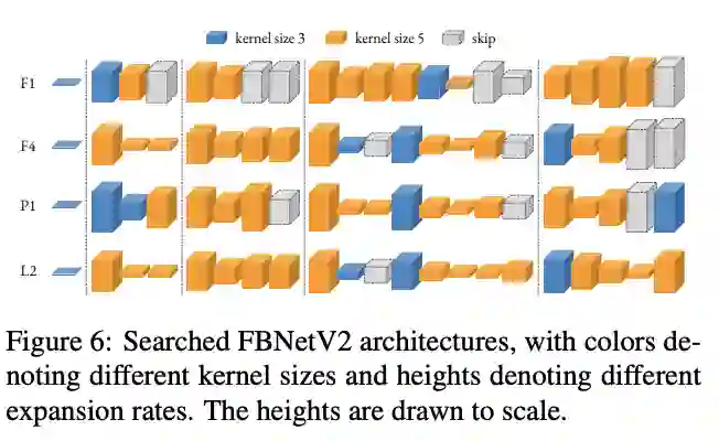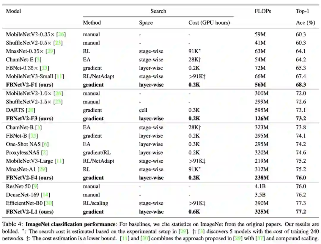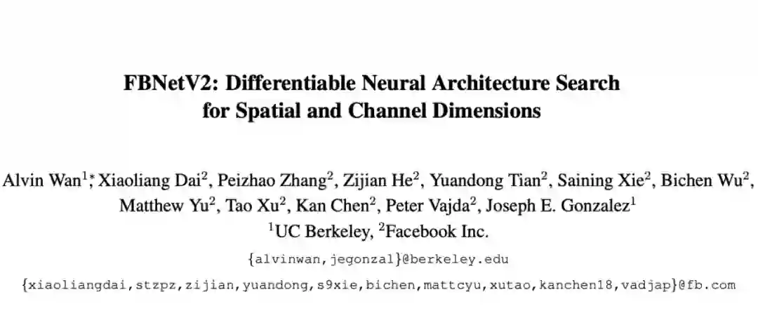 之前提到FBNet的block框架基于目前主流MobileNetV2和ShuffleNet设计,更多地是对其结构参数进行搜索,所以在网络结构有一定的束缚。FBNetV2马上来了个 倍的提升,各方面效果也比目前大多数的网络要好,但整体看下来,论文更像一个量化方法,因为基底还是固定为现有网络的结构设计。