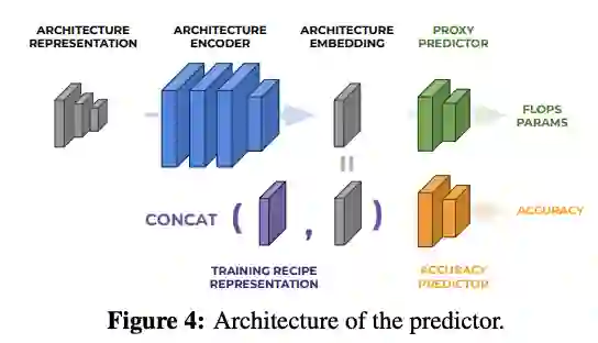 预测器的结构如图4所示,包含一个结构编码器以及两个head,分别为辅助的代理head以及准确率head。代理head预测网络的属性(FLOPs或参数量等),主要在编码器预训练时使用,准确率head根据训练参数以及网络结构预测准确率,使用代理head预训练的编码器在迭代优化过程中进行fine-tuned。