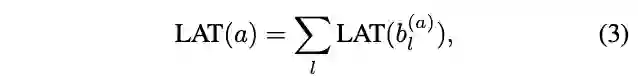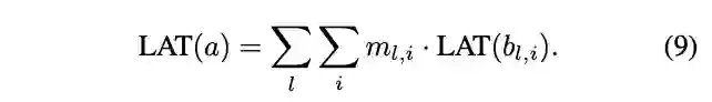 表示交叉熵损失, 表示当前结构在目标硬件上的时延, 控制整体损失函数的幅值, 调整时延项的幅值。时延的计算可能比较耗时,论文使用block的时延lookup表格来估计网络的的整体: