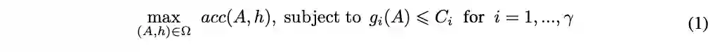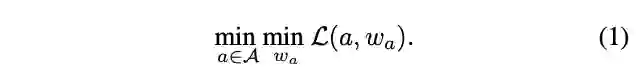 、 和 分别代表网络结构embedding、训练参数embedding和搜索空间, 计算当前结构和训练参数下的准确率, 和 分别为资源消耗计算和资源数量。