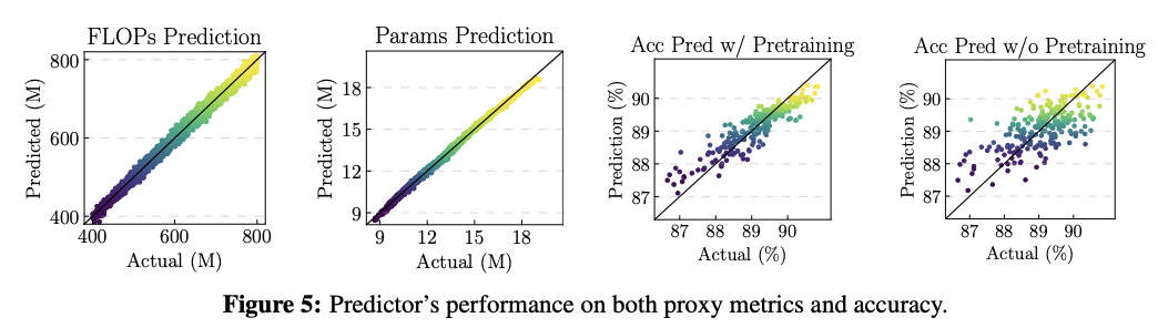 预测器包含一个预训练过程,首先训练模型以网络结构作为输入,预测网络的属性(FLOPs或参数量等),这样的训练数据是很容易获取的,随机生成大量网络并计算其属性即可,然后将编码器共享给准确率head,再正式展开后续的网络搜索中。编码器的预训练能够显著提高预测器的准确率和稳定性,效果如图5所示。