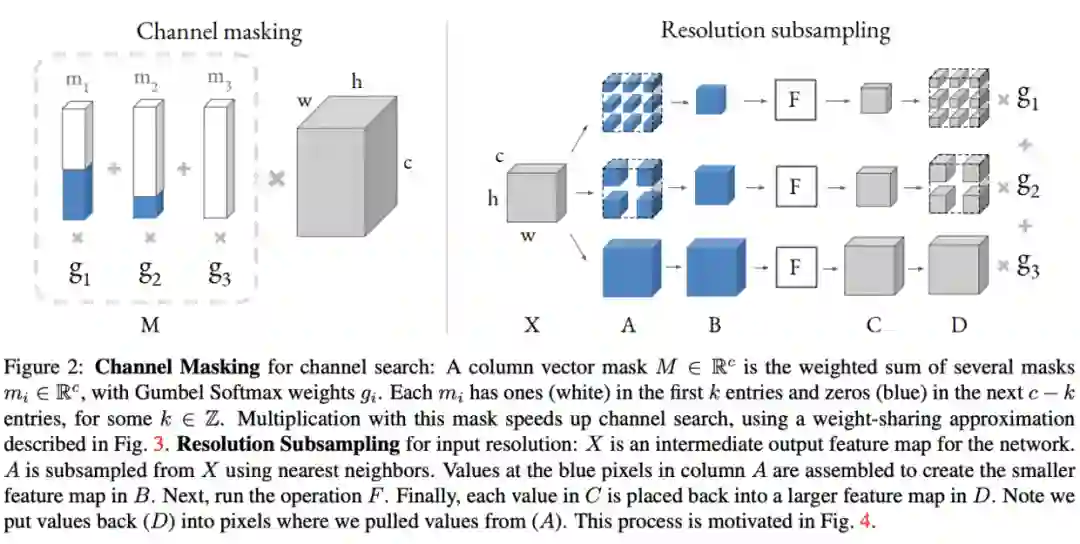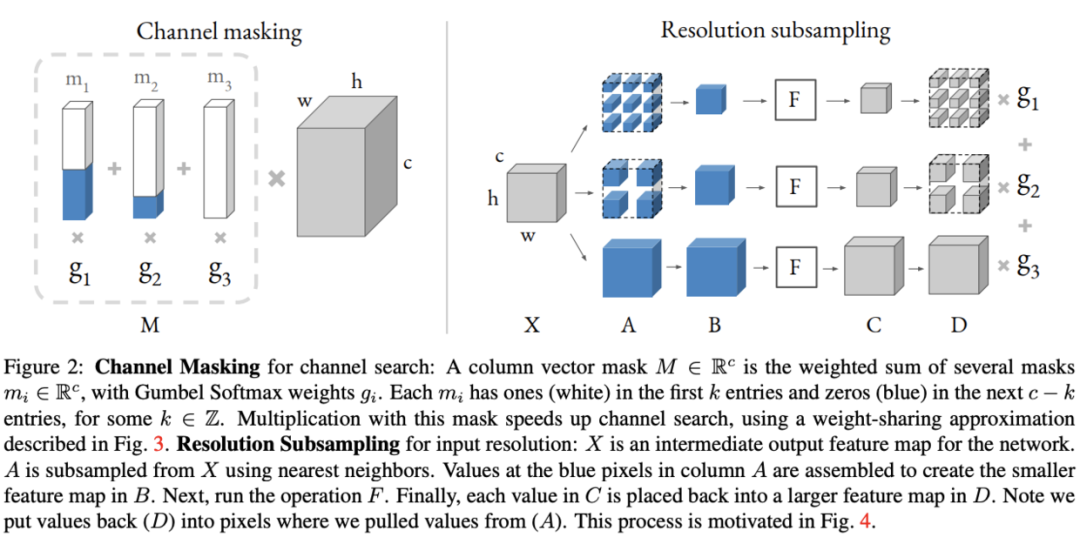 为了解决这个问题,论文提出DMaskingNAS,将channel数和输入分辨率分别以mask和采样的方式加入到超网中,在带来少量内存和计算量的情况下,大幅增加 倍搜索空间。