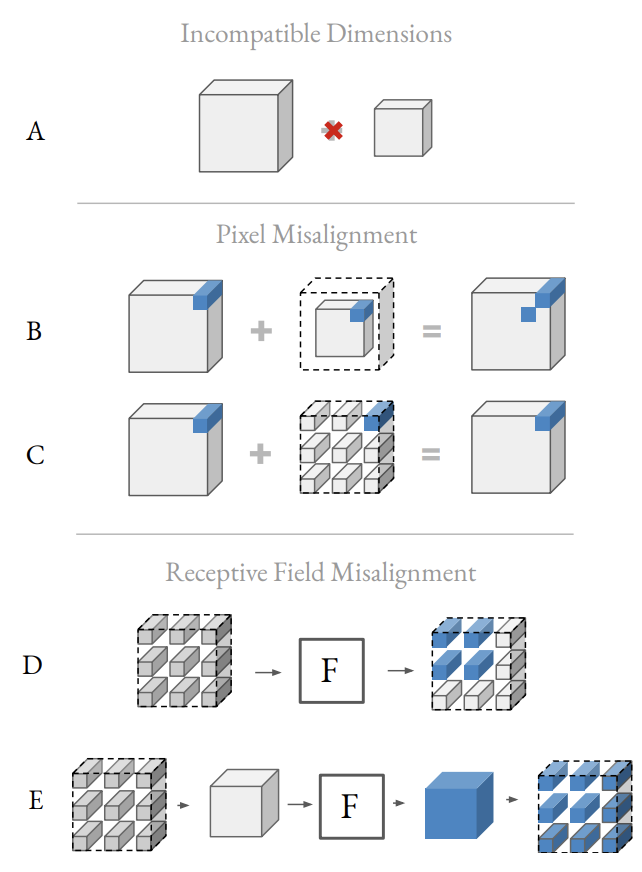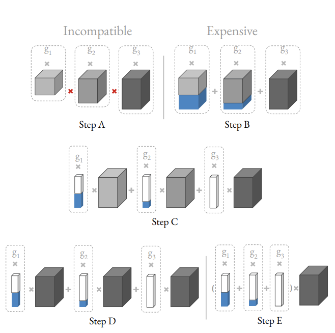 常规的实现方法如Step A,将不同大小的卷积都实例化,为了使得不同维度卷积的输出可以融合,对维度较小的特征进行Step B的zero padding。Step B可转换成如Step C,3个卷积输出一样大小的特征,再用3个不同的mask对输出进行mask(蓝色为0,白色为1)。由于Step C的3个卷积大小和输入都一样,可以用一个权值共享卷积进行实现,即Step D。将Step D的mask先合并,再与卷积输出相乘,这样可以省计算量和内存,最终得到Step E,仅需要1次卷积和1份特征图即可。