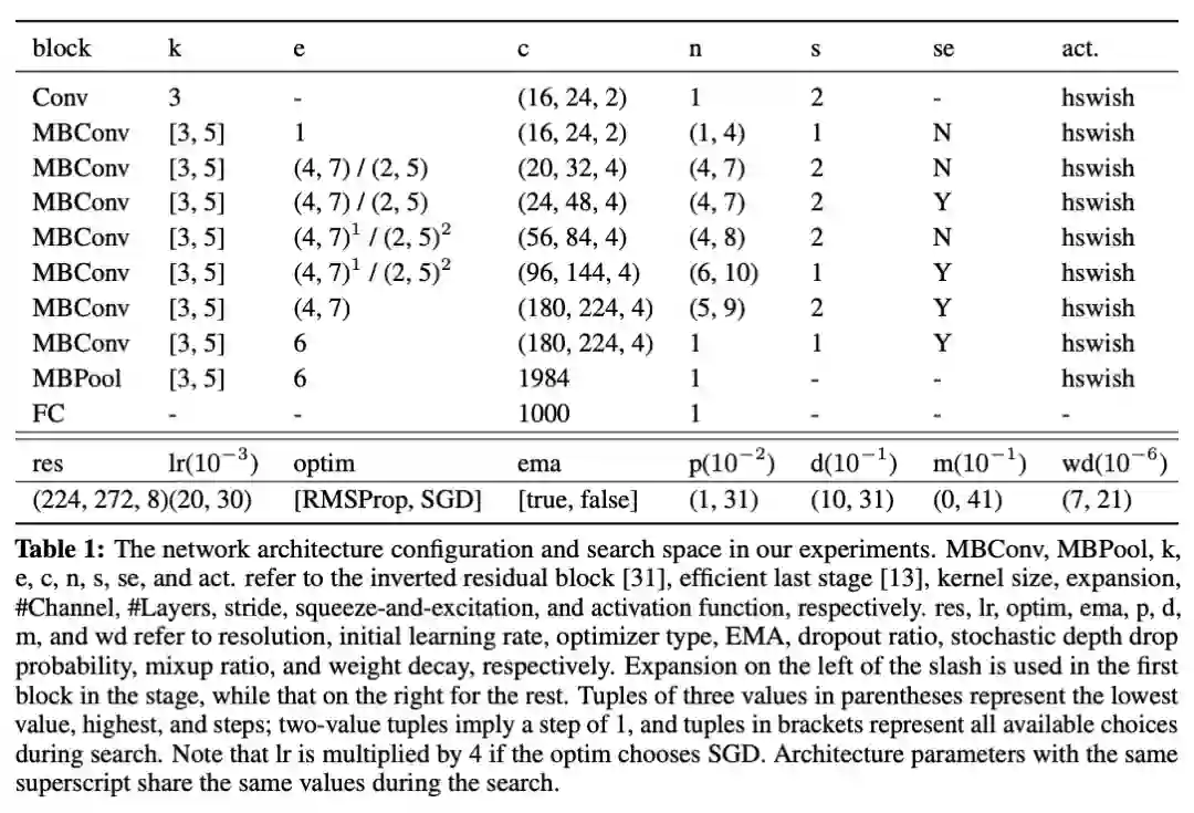 搜索空间如表1所示,共包含 种网络结构以及 种训练超参数。